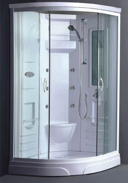 FLORA καμπίνα λευκή πλήρης χωρίς ατμό, με κάθισμα, με κρύσταλλο ασφαλείας 5mm, διάφανο τζάμι διάσταση 90*90*215